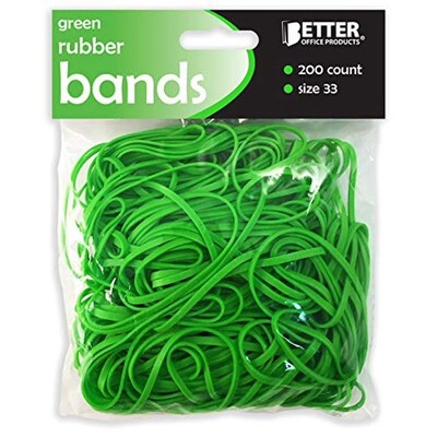 These Better Office vibrant green rubber bands come in a 200-count pack featuring a handy quantity to have on hand for organizing, securing, and color-coding. The bands are of size #33, one of the most common sizes for practical applications at home and office. Flexible but stretchy, the band is a convenient way to group items. You can utilize bands of different colors when counting or separating cash for easy distinction. Use this band for crafting, to secure rolled items, such as posters and wrapping paper, or to keep cookbooks open for easy reference. This band lets you punch up small appliance cords to keep them out of sight.