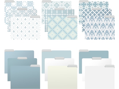 The Better Office 18-pack of gorgeous decorative file folders comes with nine Soft Floral Tile designs that are complemented by nine matching solid-color folders for a fun mix-and-match variety pack. Made of heavyweight (300gsm) paper with a laminated finish for added durability and sheen. The 1/3-cut tabs allow a sizable amount of space for customization. Use these folders in the office or at home to brighten your workspace and personalize your project folders.