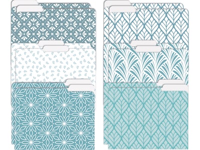 The Better Office Soft Hue Floral fashion file folders come in six petite floral designs in complementing shades of blue, printed on heavyweight (300 gsm) paper with a clear-coated finish for added durability and sheen. The 1/3-cut tabs allow a sizable amount of space for customization. Use in the office or at home to brighten your workspace and personalize your project folders.