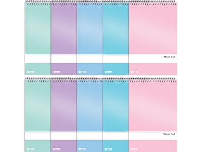 If you need quick-note steno pads for school, home, or office use, Better Office offers quality products at superb value. These 6" x 9" spiral-bound steno pads come with covers in five pastel colors (pink, teal, purple, blue, and green), two of each color. Sturdy paperboard front and back covers protect your notes and provide a sturdy surface when fixed surfaces aren't handy. The notebooks have a snag-free coil binding across the top for easy page flipping. Each page is Gregg-ruled to keep your writing in alignment line after line. White paper makes your notes pop.