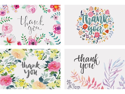 Modern cursive font and floral-themed 4" x 6" bulk thank-you cards including 100 cards, 25 of each four cover designs, and white envelopes. Four modern floral designs that bode well for almost any occasion including weddings, bridal showers, birthdays and more. Made of 90 lb. cover stock for a high-quality look and feel, these Better Office Thank You cards can be used for a number of occasions including weddings, bridal showers, birthdays and more.