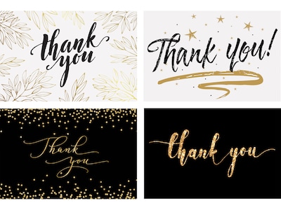 - Set of thank-you cards in four different elegant black and gold accented designs for various occasions