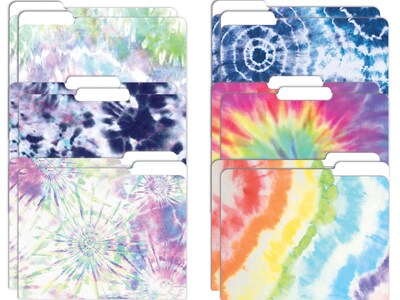 The Better Office Tie-Dye fashion file folders come in six attractive designs on heavyweight (300 gsm) paper with a clear-coated finish for added durability and sheen. The 1/3-cut tabs allow a sizable amount of space for customization. Use in the office or at home to brighten your workspace and personalize your project folders.