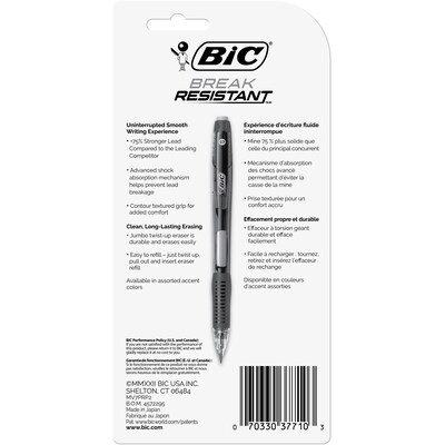 No more broken leads. Enjoy a smooth, uninterrupted writing experience with the BIC Break-Resistant mechanical pencils, thanks to the specially formulated 0.7mm lead and an innovative shock-absorption mechanism that has a 75% stronger lead. Crafted with thoughtful design from top to bottom, the BIC Break-Resistant mechanical pencil is the tool for any type of writing from jotting down a simple shopping list to composing long-form letters, drafting professional documents to taking standardized tests, and everything in between. The pack includes extra break-resistant leads and two replacement jumbo erasers for easy editing. Available in six cool and fun colors, including gray, green, purple, pink, yellow and blue, the BIC Break-Resistant mechanical pencils are as good-looking as they are functional. Avoid the frustration of flimsy lead that snaps easily and requires constant replacement with the BIC Break-Resistant mechanical pencils to go the distance and last as long as your inspiration.