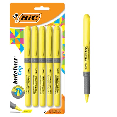 BIC Brite Liner Grip™ Yellow Highlighter and has a rubberized grip for added comfort, sold as 5 per pack.