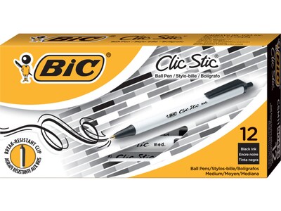 A classic BIC Clic Stic ball pen is convenient and affordable. This retractable ballpoint pen features a comfortable round barrel design perfect for all-day use. Its versatile 1.0mm medium point makes this pen a great choice for everything from list-making to note-taking. The break-resistant pocket clip makes it easy to bring the BIC Clic Stic ball pen with you, wherever you go.