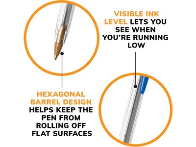 Combine exceptional performance and longevity with the BIC Cristal Xtra Smooth blue ballpoint pen. The flexible 1.0mm medium-point pen delivers crisp, legible lines, making this pen a superb choice for everyday writing activities. The pen minimizes blotting and skipping, as the tungsten carbide ball helps the blue ink spread evenly. The BIC Cristal Xtra Smooth pen has a snug, comfortable grip and a clear hexagonal barrel that lets you see how much ink remains. The matching cap includes a handy clip for easy attachment to pockets or notebooks.