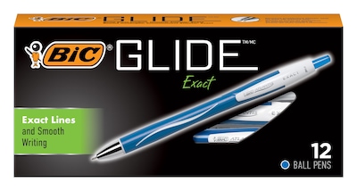 The BIC Glide Exact Retractable ballpoint pen delivers exact precise lines for clean writing and writes smoother than BIC's classic ink system. The smooth ink in the BIC Glide Exact allows for fine lines without the scratchy feeling commonly associated with fine point stick pens. The BIC Glide Exact Retractable ballpoint pen is a sleek, professional, smooth-click retractable ballpoint pen with a full grip area. The grip runs the full length of the barrel providing a comfortable and controlled writing experience. The BIC Glide Exact Retractable ballpoint pen is not only a great option for business people in the office, accounting and banking profession; it is great for everyday use wether at home, school or on the go. Available in fine point in black, blue, red, green and fashion ink.