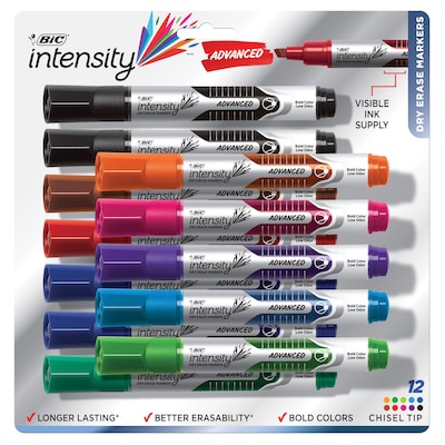 BIC Intensity Advanced Dry Erase Markers deliver both low odor AND bold writing. With their long-lasting supply of liquid ink, these tank-style markers provide smooth, consistent ink flow on whiteboards, glass, and most non-porous surfaces. These non-toxic markers also offer a visible ink supply, so you can easily check if you're running low. The versatile chisel tip helps you switch seamlessly between bold, broad strokes and fine lines, and marks erase easily with a tissue or cloth. Available in a variety of bright, vivid colors, these dry erase markers are a great choice for home, school, or the office.