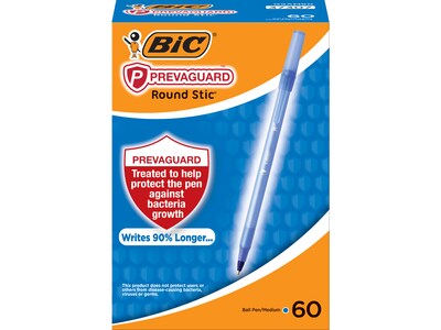 The BIC PrevaGuard Round Stic contains an antimicrobial agent incorporated into the plastic that protects the pen itself by supressing the growth of bacteria. This pen writes 90% longer on average than its analogs. The pen features a versatile 1.0mm medium point that creates vivid lines, making it ideal for a variety of writing applications. The pen comes with a reliable tungsten carbide ball point that spreads the ink smoothly and evenly. The flexible round barrel rests comfortably in your hand, while its translucent material shows the remaining ink supply, so you know when you're running low. This product does not protect users or others from disease-causing bacteria, viruses, or germs.