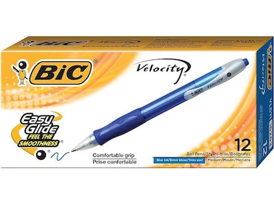 BIC Velocity medium-point blue retractable ballpoint pens deliver bold color and smooth lines.