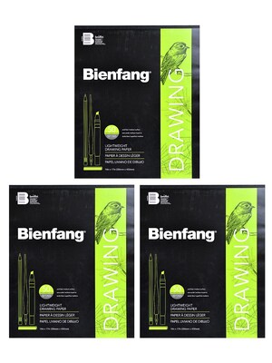 501 Giant Drawing Paper Pads by Bienfang offer a lightweight (55 lb./82 gsm), economically priced paper in the convenience of a pad. This drawing paper features a medium surface texture well-suited for any dry media including charcoal, pastel, and pencil. Its light tooth grips the powdery pigments and aids in layering. Pen and ink may also be used on this quality paper. Sheets are acid-free and made from 50% recycled materials. Each tape-bound pad contains 50 sheets and measures 14 in. x 17 in. Sold as a pack of 3 pads.