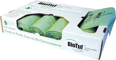 BioTuf Compostable Trash Bags are some of the strongest compostable trash bags available. These bags meet the ASTM D6400 standards and are certified by the Biodegradable Products Institute guaranteeing these trash bags will compost along with other organic materials. BioTuf Compostable Trash Bags have performance similar to regular plastic trash bags. These compostable trash bags have a star-sealed bottom which is nearly leakproof and allows transportation of refuse without concern of causing a mess. BioTuf Compostable Trash Bags come in coreless rolls for ease of use and also have a convenient dual dispensing box.