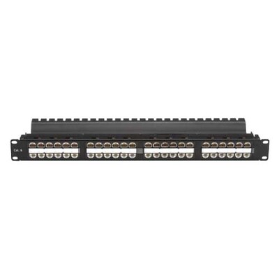 The Black Box SpaceGAIN JPM820A-HD black 48-port Cat6 high-density feed-through patch panel provides patching without punching down the wires to the ports. Patch panel measuring 1 3/4" x 19" x 6", is perfect for high-density applications in relay racks or communications cabinets. It contains four 10-32 cuphead screws, four 12-24 cuphead screws, eight cable ties and eight station ID labels.