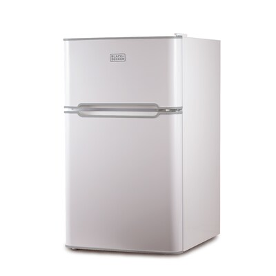 Enjoy refreshing beverages, snacks, and meals whenever you want with this BLACK+DECKER 3.1 cubic foot compact refrigerator. With fridge dimensions of 18.7" x 21.1" x 32.8" and a weight of 57.3 lbs., you can easily place this small fridge in your work office, kitchen, dorm room, RV, bedroom, and more! 2-door fridge has a top freezer compartment with 0.9 cu. ft. capacity space. Manual defrost, recessed door handles for easy opening and closing, adjustable leveling legs, reversible doors, and space-saving flat back design. Includes 2 full-width slide-out glass shelves, 1 full-width crisper, as well as door storage bins and shelves in the freezer and fridge. 2-liter bottle storage and can dispenser storage on the door. R600a refrigerant and easily adjustable temperature control. Energy Star certified.