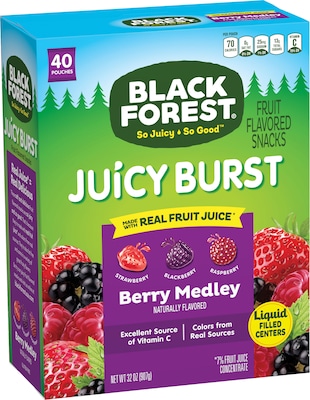 Black Forest Berry Medley Fruit Snacks are the perfect snack to enjoy at home or on the go. This 32 ounce box contains 40 individually wrapped 0.8 oz pouches of fruit snacks that are easy for little hands to handle. Our berry medley flavored snacks are available in strawberry, blackberry and raspberry and burst with flavor - literally! Black Forest Fruit Snacks are a good source of vitamins A, C and E and flavors and colors from real sources for you to enjoy. These soft and juicy fruit snacks are crafted with care, our fruit snacks are love at first bite. *Contains 10% fruit juice