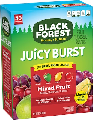 Black Forest Mixed Fruit Flavored Snacks are the perfect snack to enjoy at home or on-the-go. This box contains 40 individually wrapped 0.8 oz fruit snack pouches . Their fun, juicy centers burst when you bite into them. Black Forest Fruit Snacks are an excellent source of vitamins A, C & E, with colors and flavors from real sources. These soft and juicy fruit snacks are crafted with care. It’s love at first bite: Black Forest Juicy Burst Mixed Fruit Flavored Snacks. Black Forest Juicy Burst Mixed Fruit Flavored Snacks are part of a portfolio of irresistible fruit snacks. These snacks are made with real fruit juice* and contain colors and flavors from real sources. Made with care and craftsmanship, each sweet snack embodies the brand's commitment to quality. Hard work never tasted so good. All of our gummies and fruit flavored snacks are either gluten free or Certified Gluten Free. *10% fruit juice concentrate