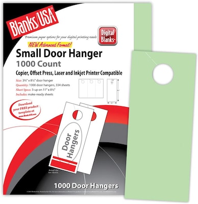 Blanks/USA® 67 lbs Digital bristol cover door hanger in green color measures 3.67" x 8 1/2" and is ideal to print on digital equipments. Perforated door hanger with 1 1/4" hole has a knob hole slit for easy use and is sold as 1000 per pack.