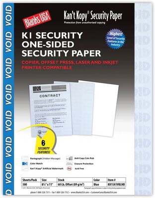 Blanks/USA® Kan't Kopy® K1 Security paper in blue color measuring 8 1/2" x 11" preserves documents for longer period of time. Paper is free from acid making it compatible with copiers, inkjet, laser and offset printers, sold as 500 per pack.