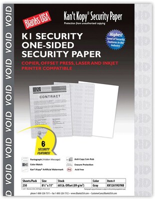 - One-sided security paper has 6 security features to keep your printable documents safe from unauthorized copying or modifications
