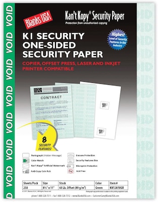 Blanks/USA® Kan't Kopy® K1 Security paper in green color measures 8 1/2" x 11" and has 6 security features to protect documents. Paper safeguards against erasing/modifying and scanning erasures protection, sold as 250 per pack.