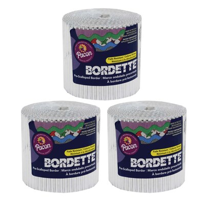 Bordette® is the original, pre-scalloped, fade-resistant decorative border. The sturdy corrugate provides a unique 3-dimensional appearance on any flat surface. It bends, molds, turns and twists to create unique layered designs. Packaged in a perforated roll, Bordette is easy to separate. Add sparkle to create eye-catching appeal on any flat surface! Each roll includes 2.25" x 25'. Sold as a pack of 3 rolls.