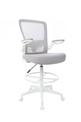 The Boss Grey Mesh Flip Arm Stool with White Frame blends sleek, modern style with ergonomic comfort, featuring flip-up arms, lumbar support, and a footring for an elevated seating experience in any professional or creative workspace.