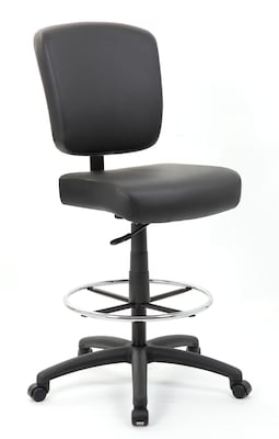 These extra-large, heavy-duty stools have both oversized seat and back cushions, which are enveloped in a sleek Black CaressoftPlus vinyl upholstery. Its pneumatic gas lift allows for flexible adjustment of the seat height, catering to your comfort and workspace needs. The inclusion of a 20-inch chrome footring provides substantial leg and foot support, while the expansive 27-inch black nylon base ensures steadfast stability. Maneuverability is a breeze, thanks to the hooded double wheel casters that enable seamless movement in any direction and offers a 300 lb. capacity.