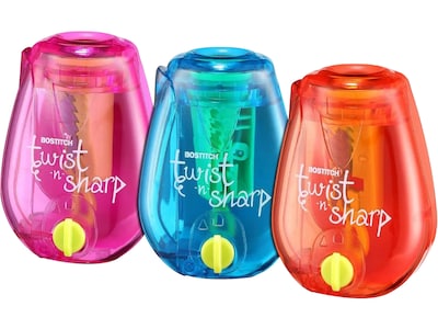 These Bostitch Twist-n-Sharp Kids manual pencil sharpeners have a distinguished ratchet mechanism that offers easy twist and fast sharpening. The adjustable knob makes a sharp or blunt pencil tip. Their compact design conveniently fits in any school or travel bag. The Tip Saver technology prevents oversharpening, extending a pencil life. The easy-clean shavings tray captures pencil shavings.