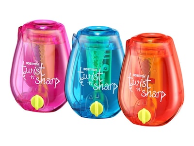 Get sharp pencil tips for clear, easy writing with this assorted Bostitch Twist-n-Sharp manual hand-held pencil sharpeners. Keep writing utensils ready to go with these pencil sharpeners. With a simple twist, the ratchet mechanism offers fast sharpening, while the adjustable knob lets you customize the point of the pencil tip. These Bostitch Twist-n-Sharp manual hand-held pencil sharpeners come in three fun colors and the Tip Saver Technology protects against over sharpening, maximizing a pencil's life.