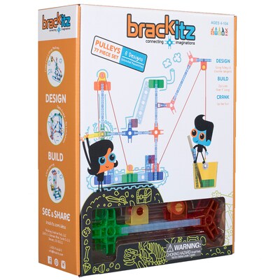 Brackitz award winning, open-ended building toys are unique in their ability to connect anywhere, at any angle. The Brackitz pulley set includes 77 pieces. Build 8 contraptions - from a moving drawbridge to a 4-foot flying zip Line to a bucket escalator. With pulleys, axes, hubs, hook, crank and string, engineers of all ages will have fun building and cranking contraptions that haul, lift, slide and move up/down. No hard hat required. With a strong emphasis on STEM learning skills, This educational toy helps children build a solid foundation in science, technology, engineering and mathematics. Recommended for ages 7 and up.