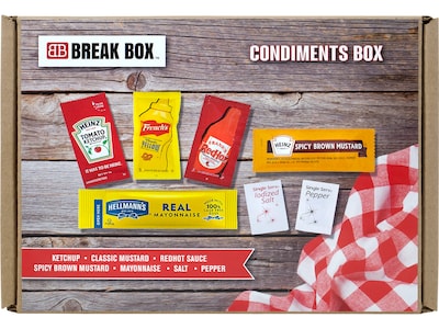 - Condiment box with packets of salt, pepper, brown mustard, mustard, mayonnaise, hot sauce, and ketchup
