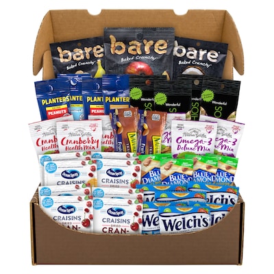 - Box includes Welch's Fruit Snacks, Ocean Spray Craisins, Planters Peanuts & Cashews, Blue Diamond Almonds, Wonderful Pistachios, Bare Chips Variety, Natur'es Garden Cranberry Health Mix and Omega 3 Deluxe Mix, Nature Valley Fruit & Nut bars