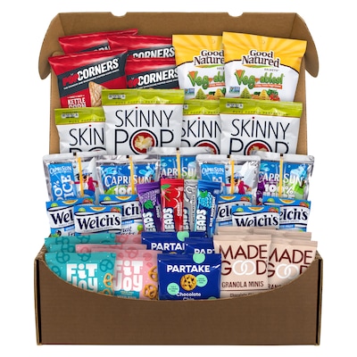 - This box includes Popcorners, Herr's chips, Skinny Pop, Capri Sun, Airheads, Partake cookies, Madegood granola bars, Welch's fruit snacks and Fit Joy pretzels