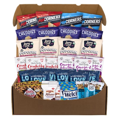 All cravings will be satisfied with the variety of snacks found in the Salty & Sweet Snack Box! With 43 items featuring brands like Cheddies, Popcorners, Lesser Evil, Pepperidge Farm, Nature’s Garden, and many more, there is something for everyone. Packaged individually, they are perfect for lunch, school, office or as an on-the-go snack. Stock up your office or pantry with this variety pack!