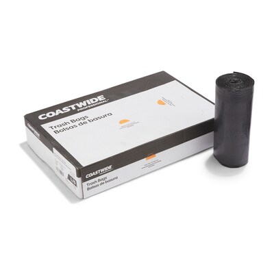 Eliminate leaks when transporting wet trash with these waste disposal bags. The polyethylene plastic construction offers extra strength when handling heavy or sharp objects, while the snap-fit hold and proper overhang ensure the bags stay in position after placement. These Coastwide Professional™ AccuFit low-density black trash bags are packed in coreless rolls for easier dispensing.