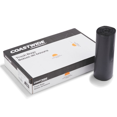 Load up your janitorial closet with this 100-count carton of trash bags. Each one holds up to 56 gallons for businesses that go through lots of garbage, while the star-sealed bottom helps prevent leaks when removing wet trash from office restrooms. The black coloring keeps contents hidden for a more pleasing look. These Coastwide Professional™ trash bags are made of reprocessed resin for added sturdiness and support.