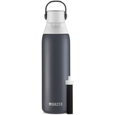 Drink healthier, great-tasting tap water with the BPA-free Brita Stainless Steel Premium Filtering Water Bottle. This durable, double-wall insulated filtered water bottle stays cold for a full 24 hours, making it fantastic for long road trips, all-day sports tournaments or office use. The Brita water filter bottle utilizes an activated carbon block filter to cut the taste and odor of chlorine and reduce particulates in water as you drink. You can replace 300 standard 16.9-oz. single-use plastic water bottles with just one water bottle filter. It's an easy way to stay hydrated, save money and reduce plastic waste. Created for effortless convenience, this water bottle features an enclosed, easy-sip straw, a built-in carrying loop for grab-and-go portability and a one-handed push-button lid. The bottle also has a leakproof design to help you avoid surprise drips and spills. Get great taste, less waste and more savings from Brita.