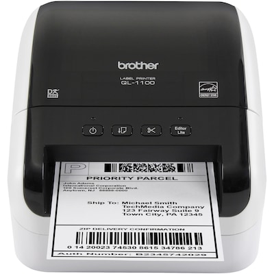 The Brother QL-1100 lets you create cost-effective paper labels for packages, envelopes, postage and more. The automatic crop function lets on-line sellers easily print product and other barcode labels from A4/Letter size label sheet templates (Windows only). It delivers fast printing up to 69 standard address labels per minute with black text at 300dpi. USB Host interface offers additional functionality. Auto cutter allows for printing 1 or multiple labels at a time, helping eliminate wasted labels sheets. The "Plug & Label" feature supports quick label printing of most basic labels - no software installation required for Windows PCs. Print from Microsoft Word/Excel/Outlook. Convenient Brother DK drop in labeling supplies. Needs no ink or toner.