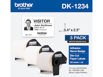 Brother DK-1234 Adhesive Name Badge Paper Labels, 3-4/10" x 2-3/10", Black on White, 260 Labels/Roll, 3 Rolls/Box (DK-12343PK)