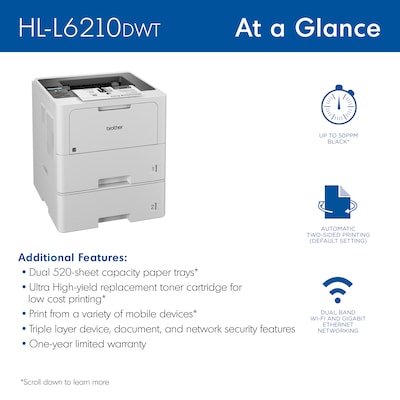 The Brother HL-L6210DWT business monochrome laser printer is a great choice for busy offices and workgroups with higher print volumes that need fast, high-quality output, low-cost printing, large paper capacity, and advanced security features. This high-performance printer helps to increase productivity with a fast print speed of up to 50ppm(1). Reduce paper refills with dual 520-sheet capacity paper trays. Offers a large, expandable paper capacity that is scalable as your business needs grow. Delivers low-cost printing by using the TN920UXXL Brother Genuine ultra high-yield replacement toner cartridge. Triple Layer Security features help to limit document and device access and protect against network intrusions. The HL-L6210DWT also provides flexible connectivity with built-in Gigabit Ethernet and dual band wireless networking, plus convenient mobile device printing to meet mobile workforce demands(2).