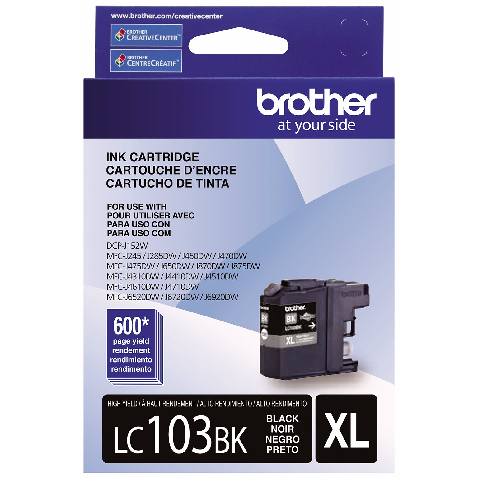 Cover printing needs in the classroom, home or small office with this Brother LC103 high-yield black ink cartridge. Produce archival-quality documents with this long-lasting ink cartridge. Crafted to work with select Brother inkjet printers in seamless unison, this ink cartridge is simple to install and produces high-quality results. This Brother high-yield ink cartridge has a production capacity of 600 pages and features black ink, delivering bold, sharp text, making it ideal for printing contracts, reports and other documents.