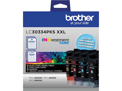 Always trust genuine Brother ink for superior inkjet print quality and performance you can consistently rely on. These Brother INKvestment Tank LC30334PKS XXL super high-yield ink cartridges deliver consistent, professional print quality and ultra convenience, with yields of up to 3000 pages for black and up to 1500 pages for color cartridges. Brother Genuine INKvestment Tank ink is intelligently engineered to work seamlessly with your Brother INKvestment Tank inkjet printer for consistent, reliable results.