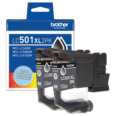 Reliable performance and outstanding print quality are hallmarks of Brother Genuine Ink. Formulated specifically to work with your Brother Work Smart printer, o produce premium prints. Improve your efficiency - get more ink and fewer interruptions with high yield cartridges. For everything you print, from airline tickets to homework, you can trust Brother Genuine Ink for consistent, premium performance with your Brother printer. The LC501XL2PK Twin Pack High Yield Ink includes two black ink cartridges to produce bold, sharp prints with rich black for up to 500 pages each.* Bundled for savings and your convenience, it's the economical way to replace the black ink cartridges in your printer, and stay stocked for when you need it most. Print Confidently with Brother Genuine LC501 Ink in your Work Smart 1260, 1360, and 1410 - the only brand we recommend for your Brother printer.