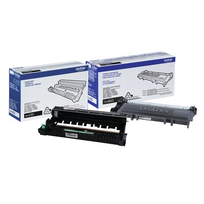 The Brother DR-630 Black Drum Unit produces richer, deeper colors and delivers superior results for all your printing needs while yielding up to 12,000 pages and the TN-660 toner cartridge prints high-quality documents, photos, and graphics. The toner cartridge can yield up to 2,600 pages before needing to be replaced, so it's ideal for offices with a high volume of printing. This cartridge produces a rich black toner hat gives your documents a crisp, clear, professional look, and installation is fast andeasy.