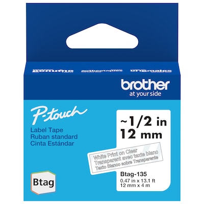 Brother P-touch Btag Label Tape, 1/2" x 13.1' (12mm x 4m), White on Clear (BTAG135)