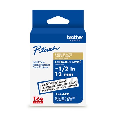 Brother P-touch Premium Matte Laminated Label Tape, ~1/2" x 26.2', Black on Clear (TZeM31)