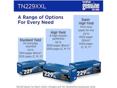 Print confidently with the Brother genuine TN229XXL superhigh-yield magenta toner cartridge. This toner produces magenta tones on every page while providing reassuring compatibility, as well as convenience and cost savings. Brother genuine is the only toner brand recommended for Brother multifunction and all-in-one digital color printers. Perfect for higher volume printing, the TN229XXL delivers dependable, professional results with an up to 4000-page yield (approximate toner cartridge yields in accordance with ISO/IEC 19798). The Brother genuine toner is the trusted choice for creating professional, laser-quality business documents that demand attention and get noticed.
