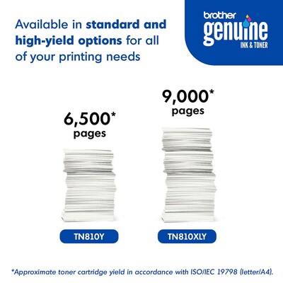 • SUPERIOR LASER PRINT QUALITY: Trust Brother Genuine TN810XLY toner for superior laser print quality and performance you can consistently rely on for up to 9,000 pages(1).