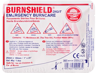 The Burnshield Digit emergency burn care foam dressing is soaked in a sterile trauma burn gel and is used specifically to individually wrap fingers and toes to prevent them from binding when burnt. This foam dressing is supplied in a foil pouch. Burnshield can be used for minor burns and scalds. With its high water content, the Burnshield hydrogel cools and soothes by absorbing and dissipating heat, which minimizes skin damage. The gel is clear, which makes it easy to assess the wound, nonstick, and will not adhere to the wound. The Burnshield hydrogel is a natural antibacterial which reduces infection. Nontoxic, nonirritant, and safe to use on children.